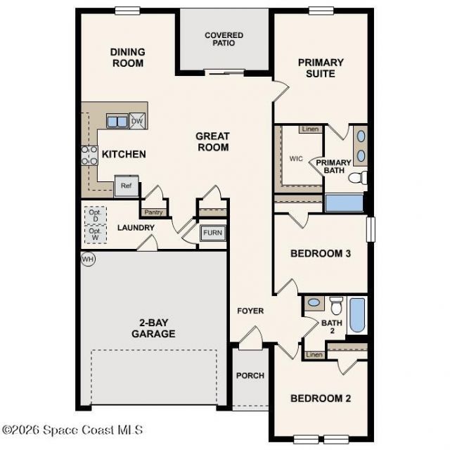 Discover your dream home in the Palm Bay Classic Community! The Prescott Plan features an airy open layout with a seamless transition between the Living Room, a well-equipped Kitchen, and a separate Dining Area, ideal for entertaining. The kitchen stands out with its beautiful cabinetry, Quartz countertops, and premium stainless steel appliances, including a range with a microwave hood and dishwasher. The serene primary suite includes a private bath with dual vanity sinks and a generous walk-in closet. Additional highlights include a convenient two-car garage, energy-efficient Low-E insulated dual-pane vinyl windows, and a one-year limited home warranty.